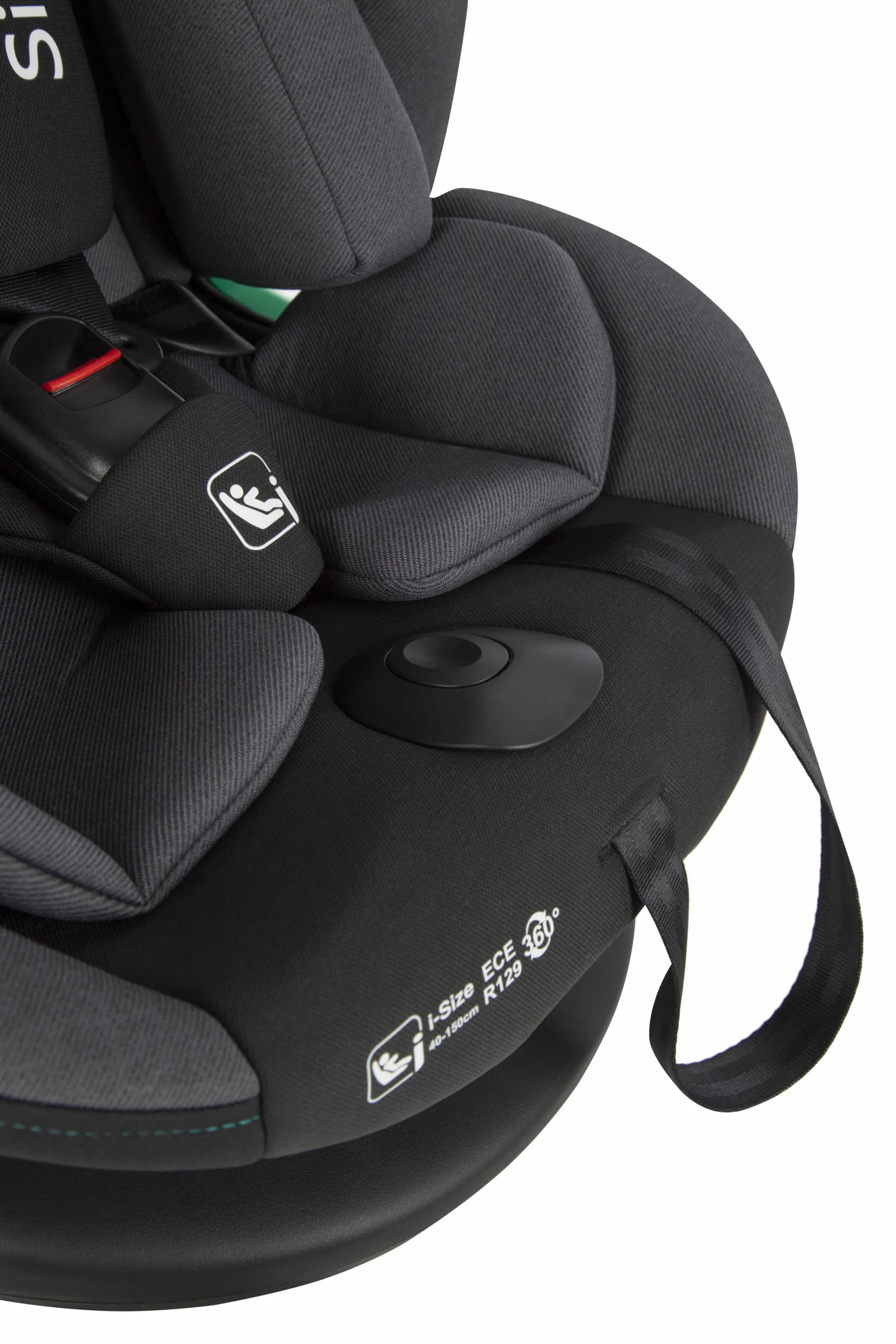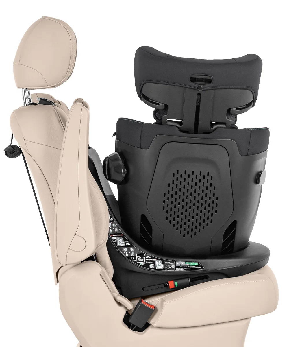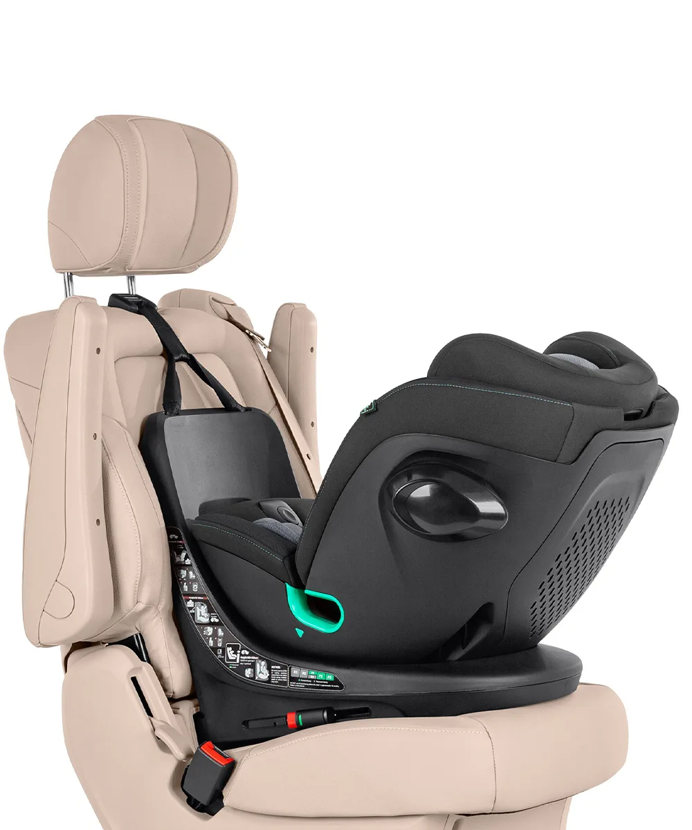 Ремінь Top Tether для надійної фіксації крісла. У комплекті анатомічна вкладка з підголівником. Трикутна подушка використовується до 60 см, вкладиш – до 75 см зросту дитини. Поворот на 360° забезпечить легку зміну напрямку сидіння, а також комфортну посадку маленького пасажира. Від 75 до 150 см зросту дитини встановлюється по ходу руху авто.
