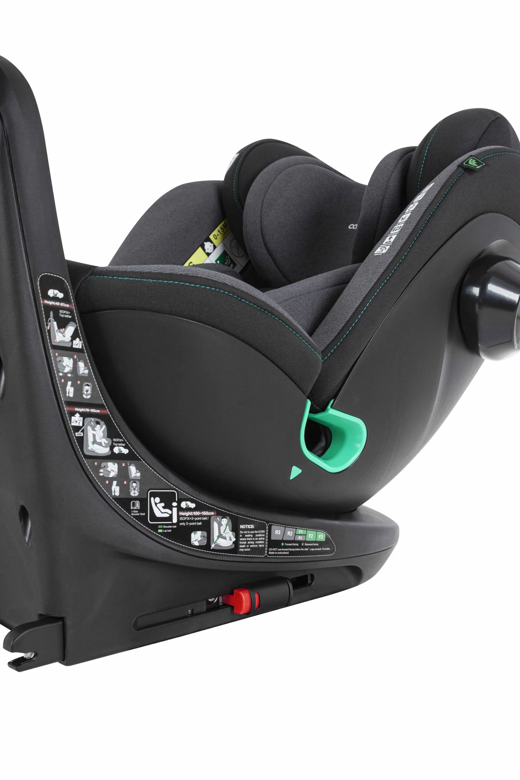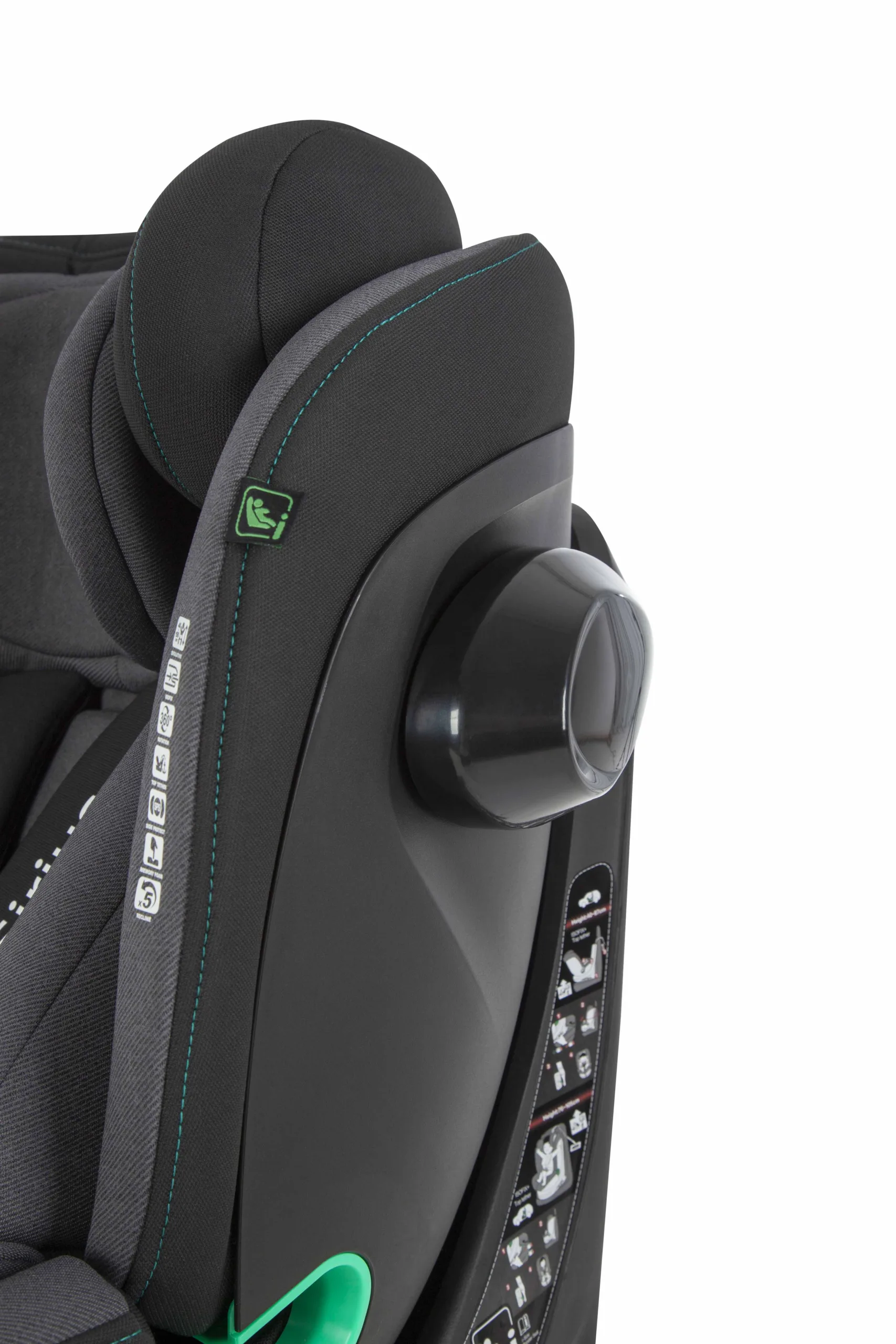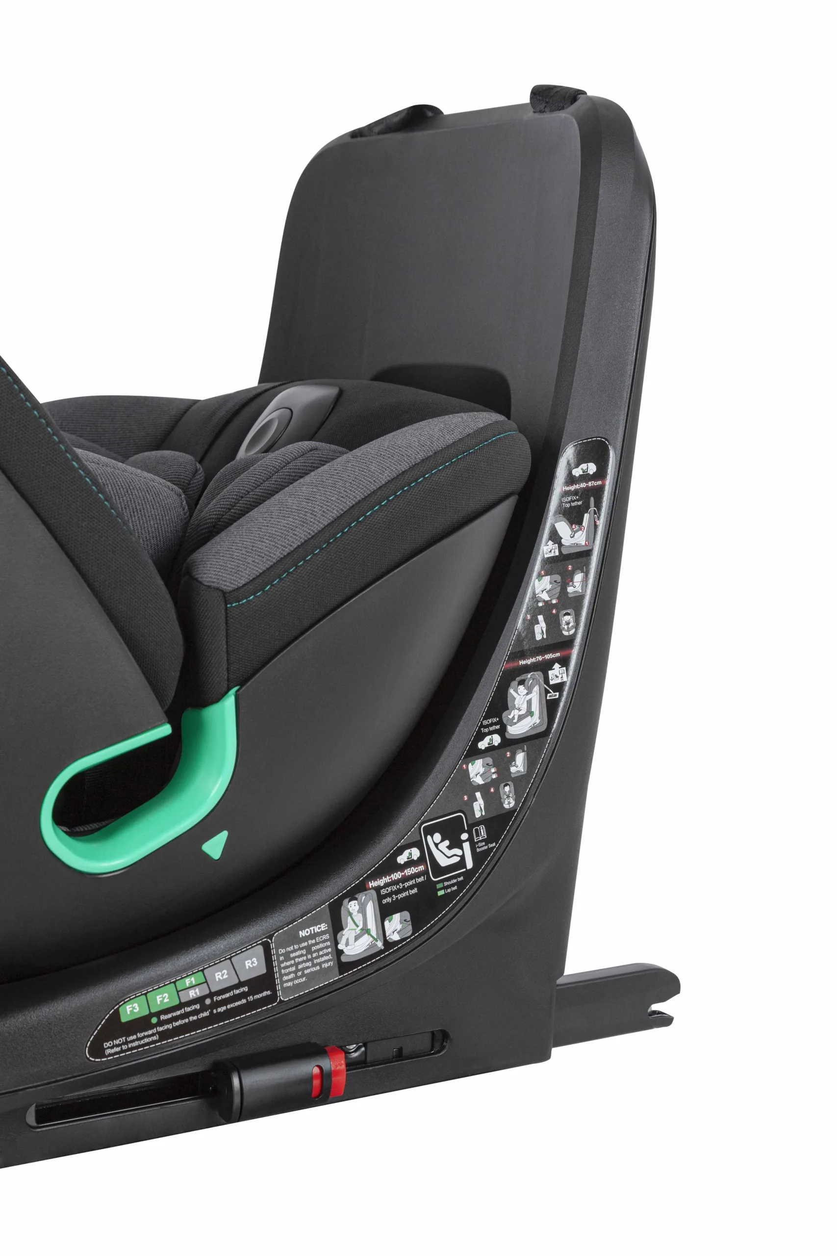 Ремінь Top Tether для надійної фіксації крісла. У комплекті анатомічна вкладка з підголівником. Трикутна подушка використовується до 60 см, вкладиш – до 75 см зросту дитини. Поворот на 360° забезпечить легку зміну напрямку сидіння, а також комфортну посадку маленького пасажира. Від 75 до 150 см зросту дитини встановлюється по ходу руху авто.