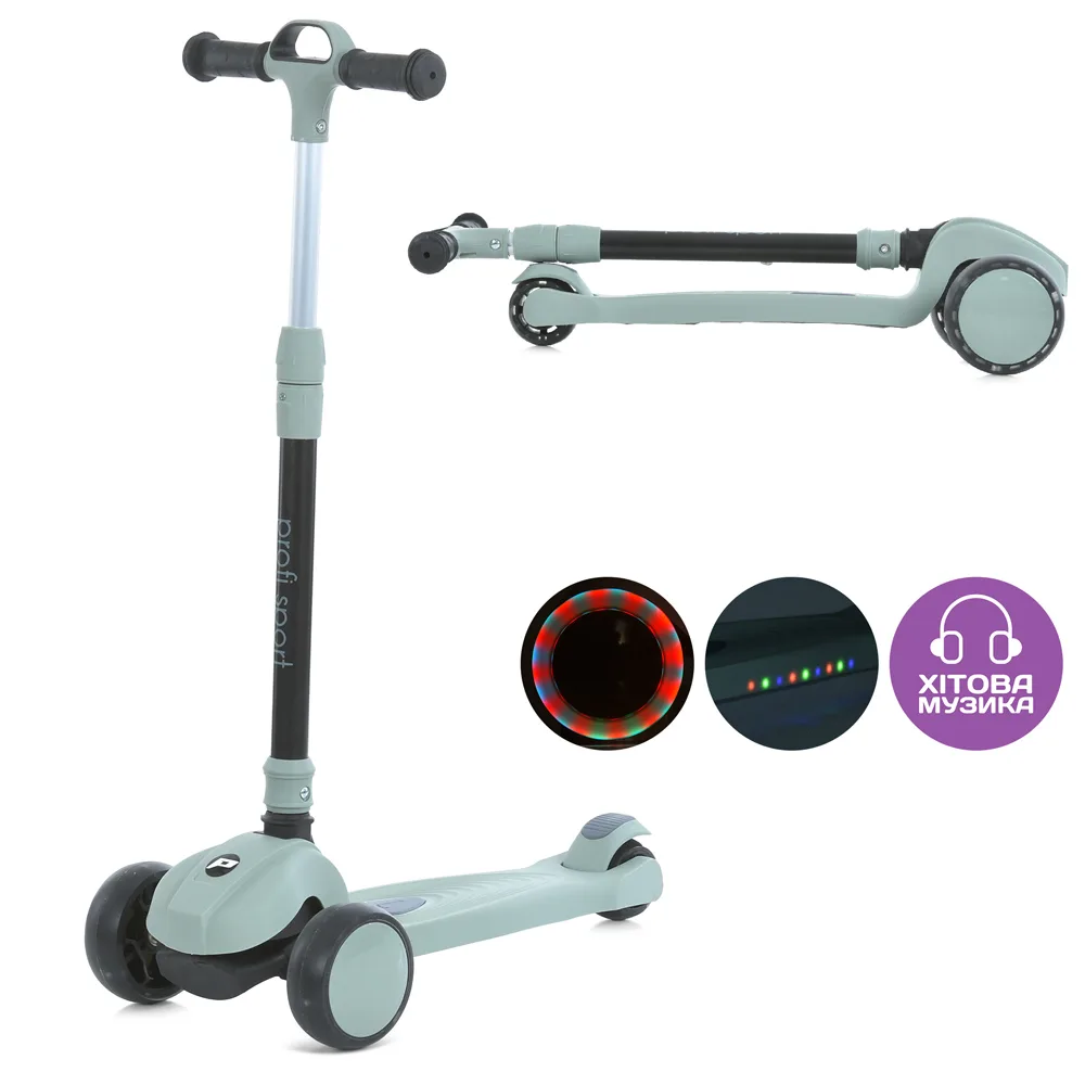 Матеріал метал+пластик, 3 колеса поліуретан (ПУ), 2 передніх 120 мм, заднє 75 мм, колеса світяться при їзді