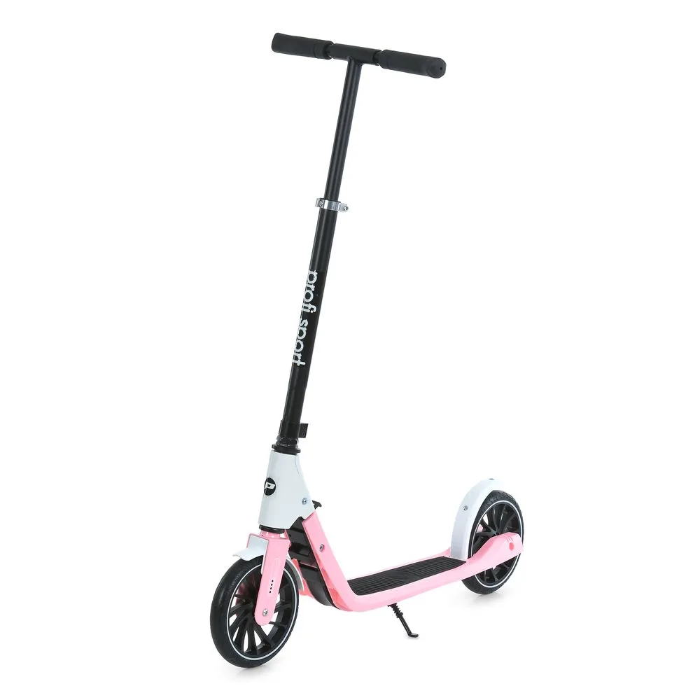Двоколісний самокат для дітей від 5ти років, матеріал метал+пластик, 2 колеса поліуретанові, діаметр 200 мм, дека 33*13 см, кермо регулюється по висоті у 3х положеннях – min 82 см, положення 95 см, max 105 см, є підставка, кермо складається