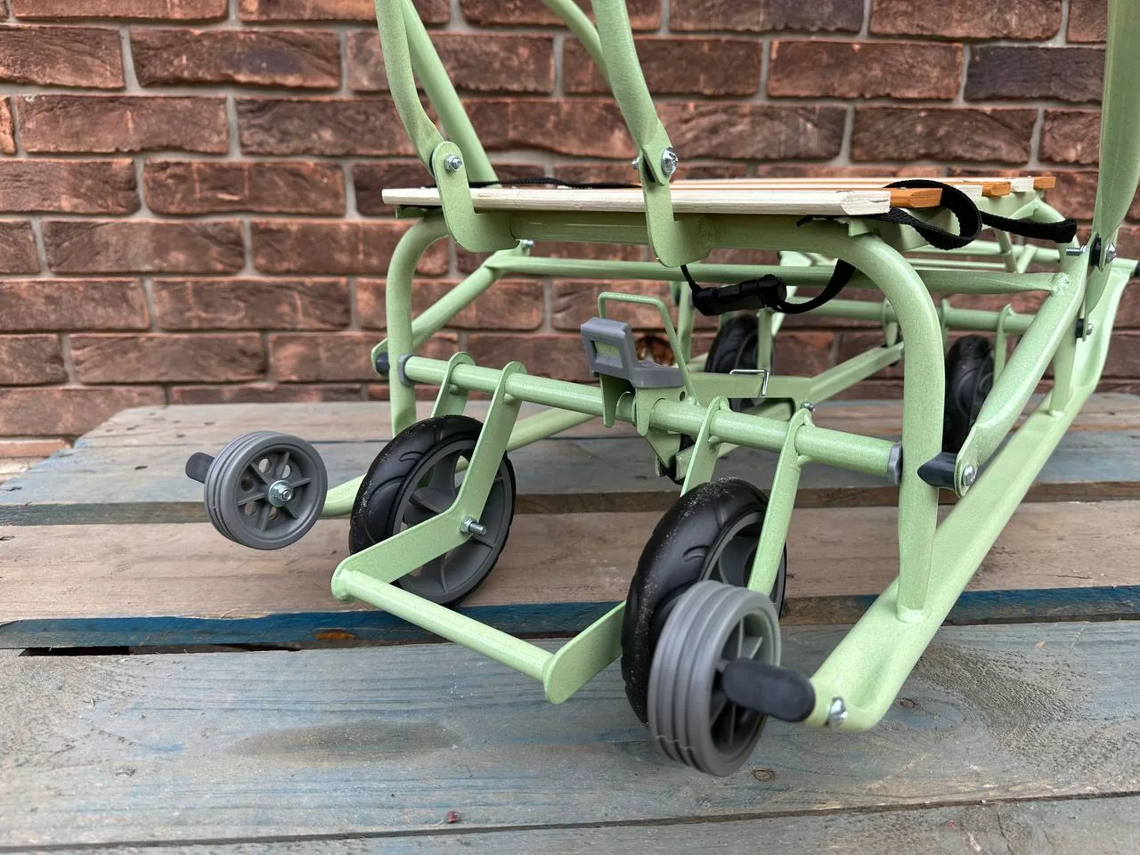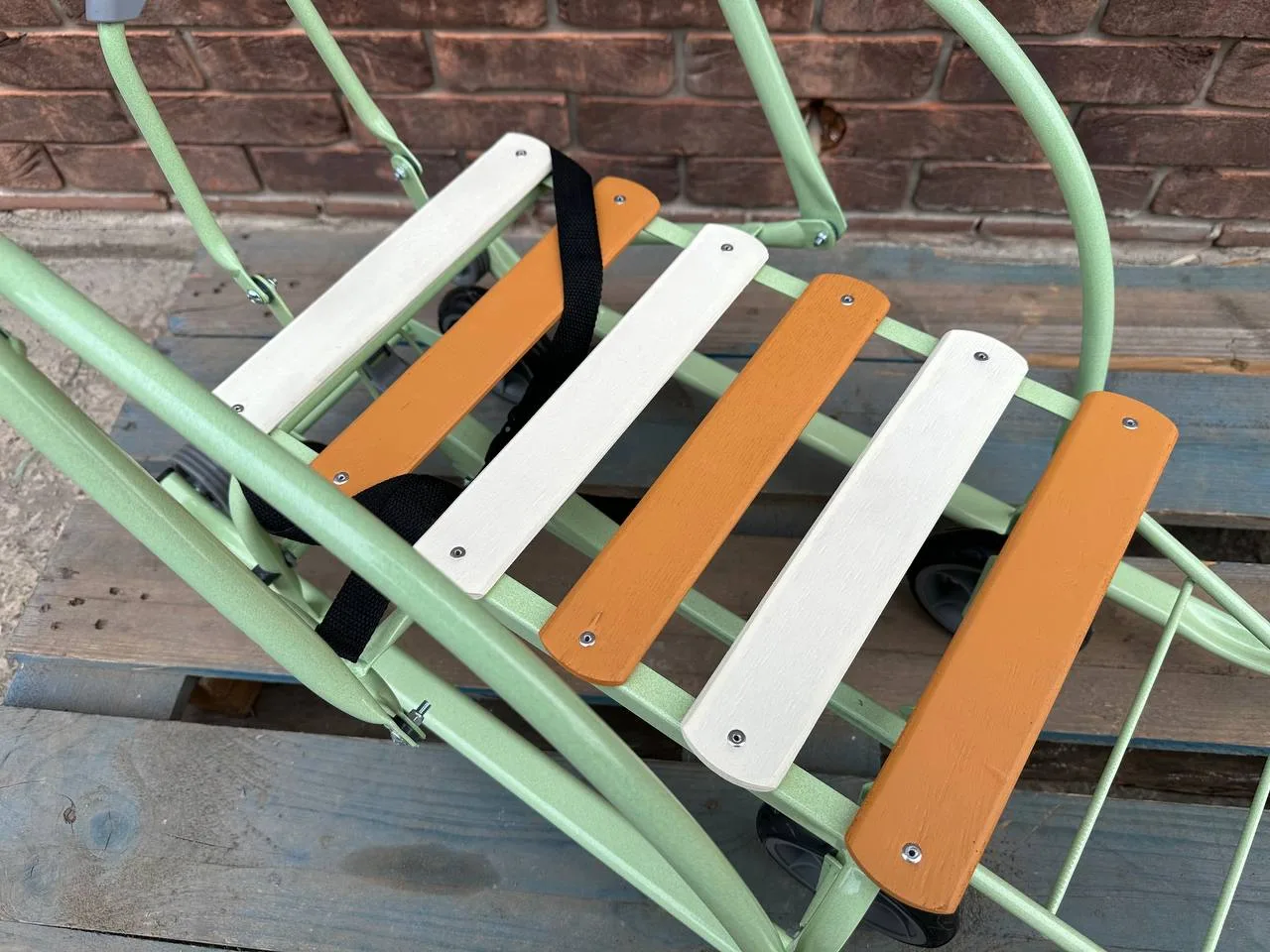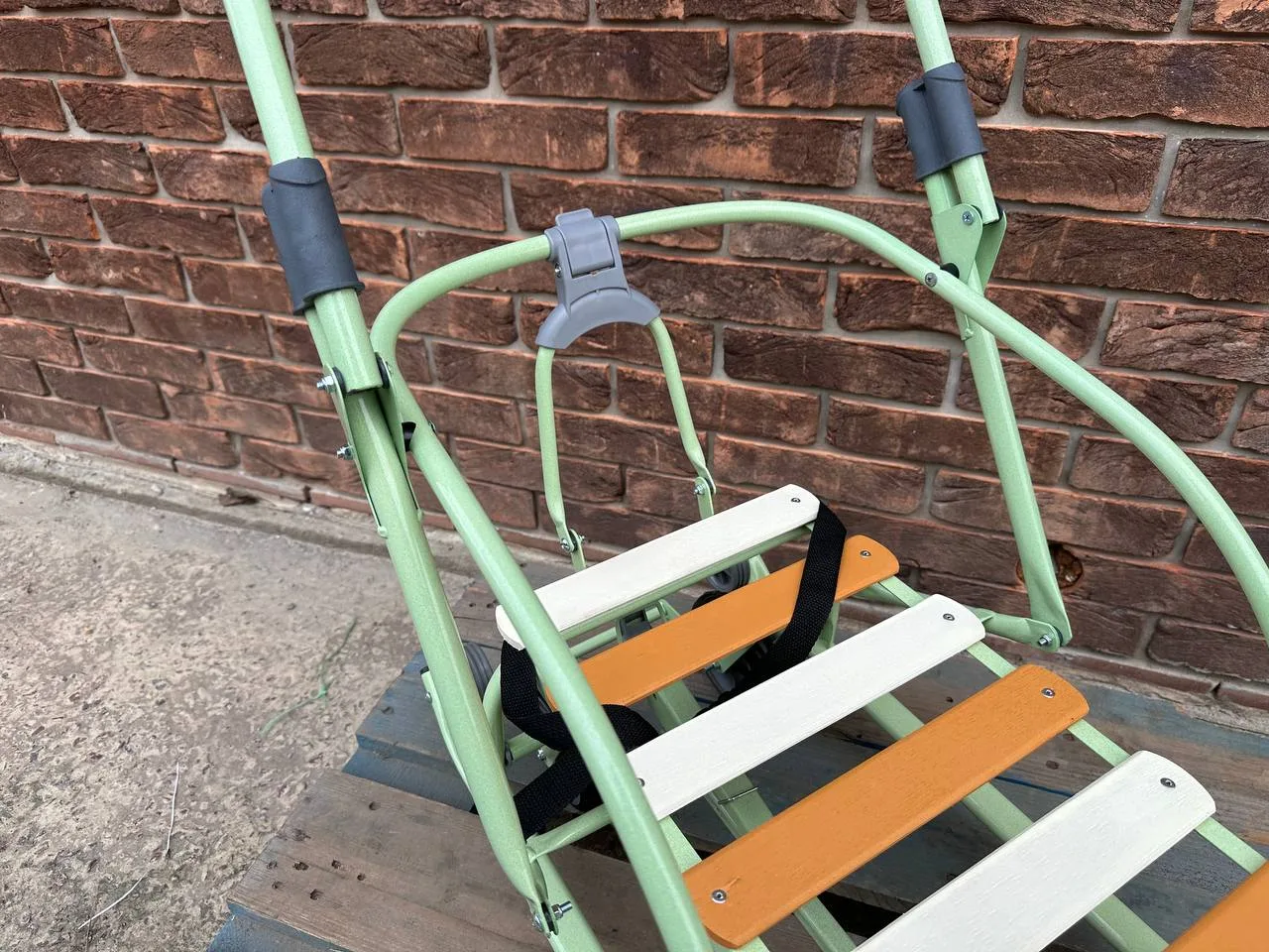 ◾️Матеріал: каркас – метал; сидіння – дерев’яні рейки; ремінь безпеки – ремінна стрічка