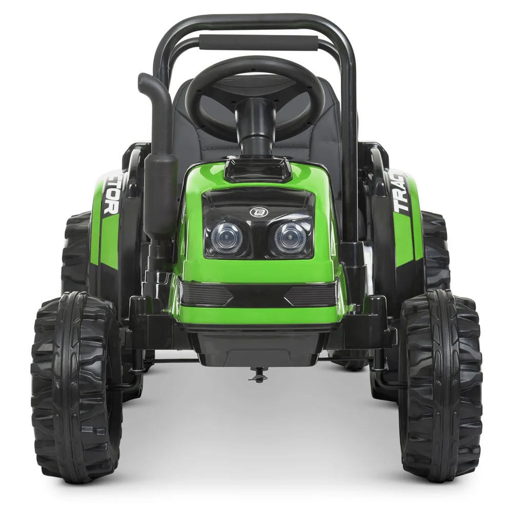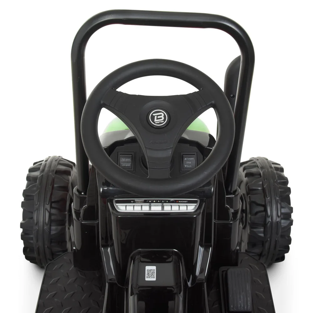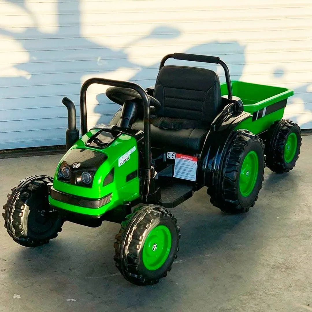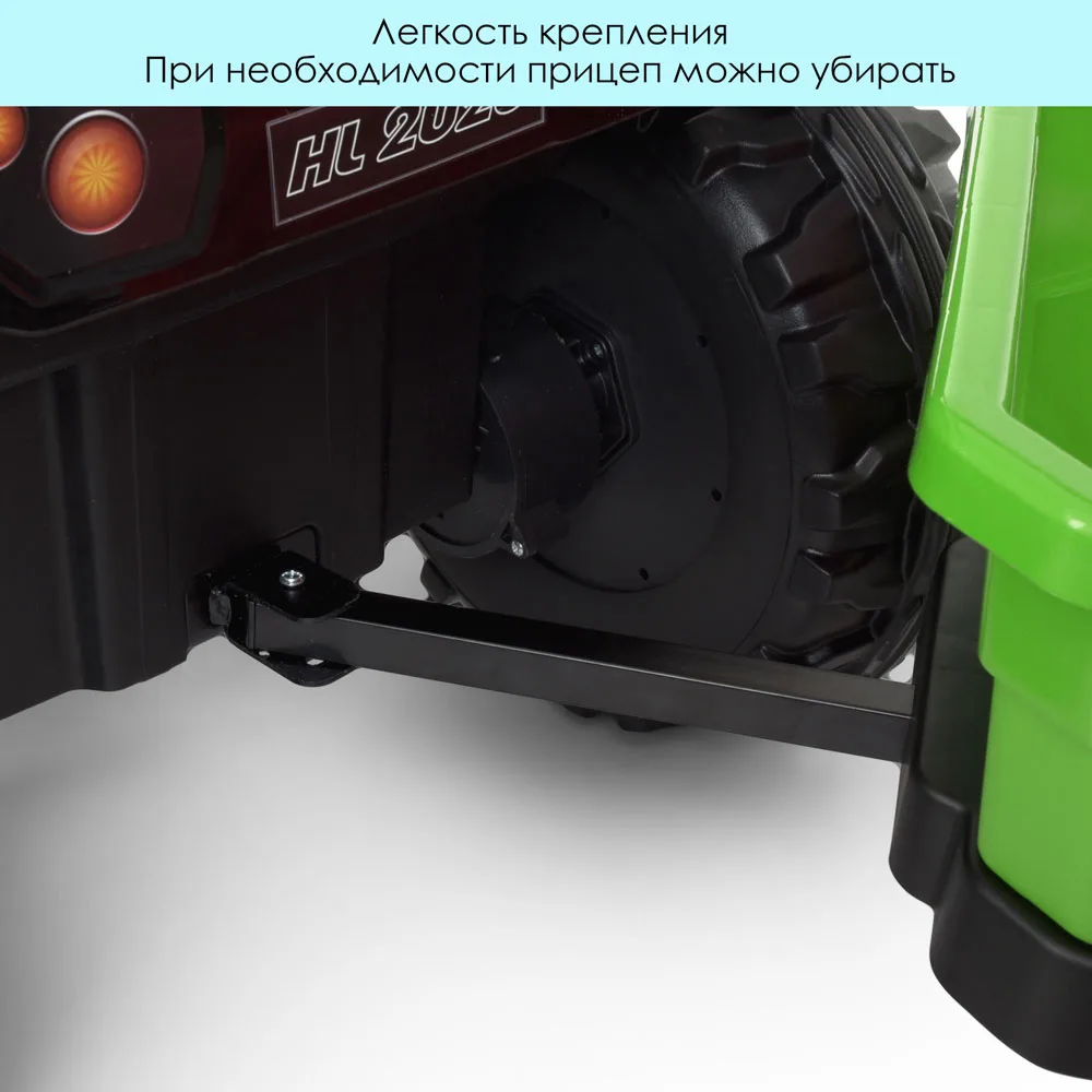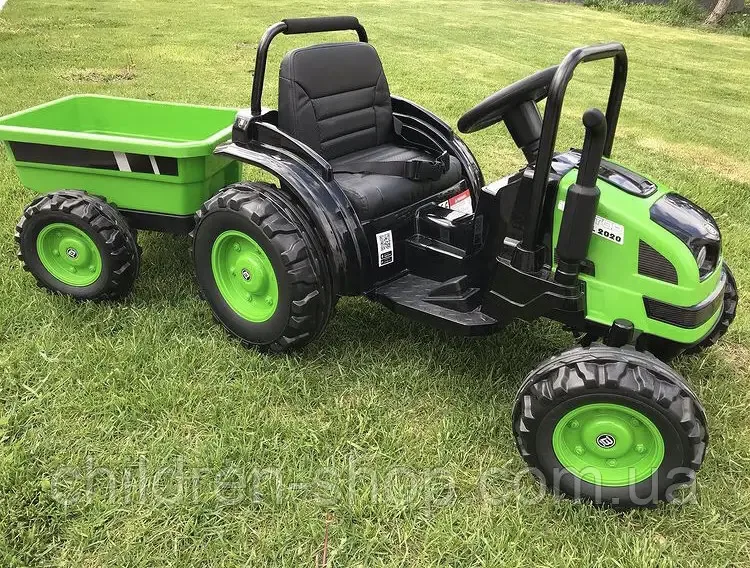 Дитячий електро трактор з причепом на пульті керування оснащений просторим шкіряним сидінням зі спинкою, колеса зроблені з матеріалу EVA, що дозволяє з комфортом їздити навіть бездоріжжям