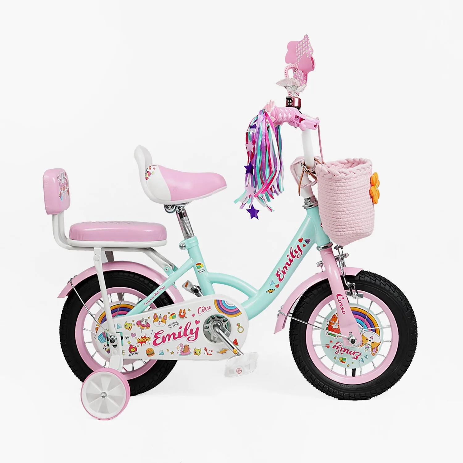Велосипед 12″ Corso Emily кошик, прикраси, ручне гальмо, дзвіночок бірюза